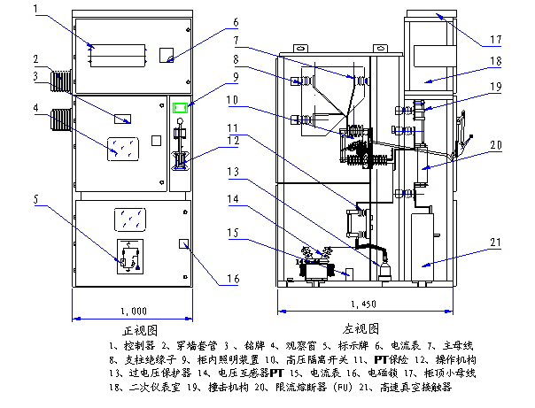 整套裝置為固定式開關(guān)柜,外型尺寸可根據(jù)用戶要求加工,6kV(或10kV)仿GZS1柜子結(jié)構(gòu)如下圖所示,對6kV、10kV的柜體,考慮今后用戶檢修方便,寬度一般不小于1000,對于35kV柜體,寬度一般不小于1800;深度和高度可以按照與其并柜的柜體尺寸來定。下圖中尺寸為推薦尺寸。